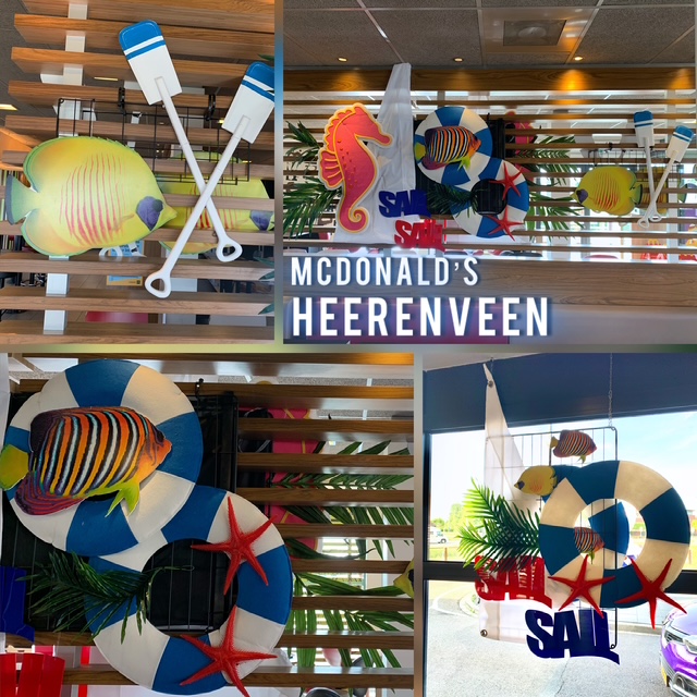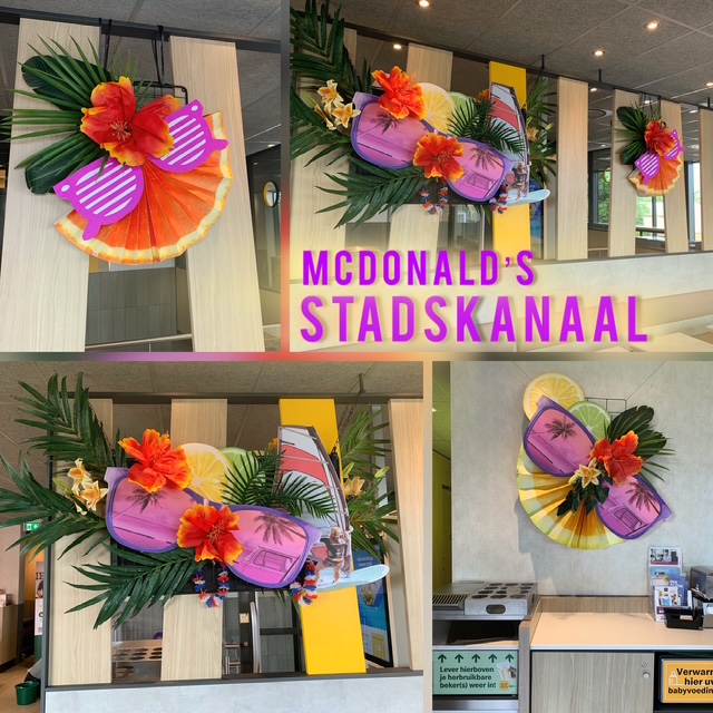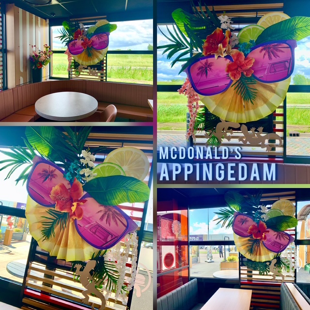 Ons favoriete thema omdat je er zo lekker vrolijk van wordt en er heel veel kanten mee uit kan. Voor dit project hebben we gekozen om vazen op een specifieke manier te laten drukken, zodat ze bij recht van voren een 3D-effect lijken te hebben. Om de kosten te optimaliseren, hebben we de vazen ingezet voor zowel lente- als zomerdecoratie. In de lente is gekozen voor bloemen met een frisse uitstraling in zachte kleuren, terwijl we voor de zomer heb gekozen voor levendige, felle kleuren.